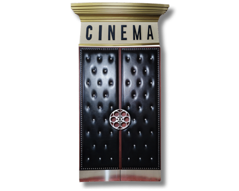 Authentic Cinema Aesthetic: Each door is designed to replicate the grandeur of classic cinema entrances, featuring a prominent “CINEMA” marquee illuminated by a soft, inviting glow. This creates an immersive atmosphere, setting the stage for an unforgettable movie night.