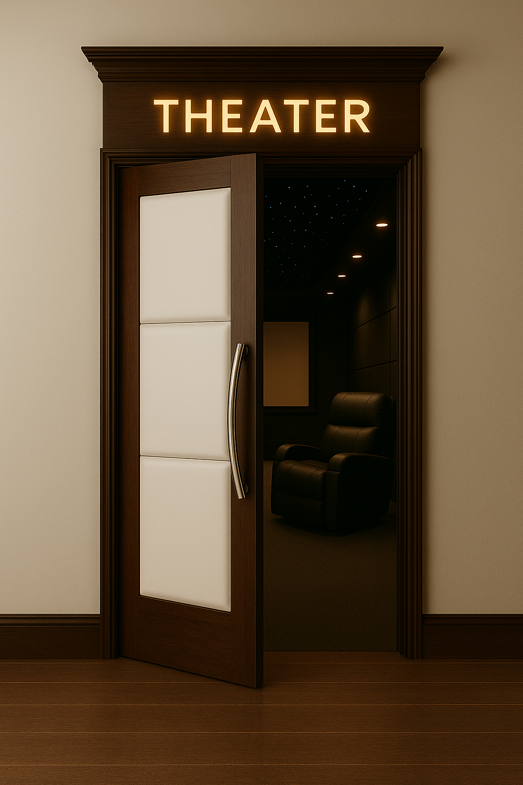Step into the world of cinematic luxury with our exquisite custom-designed home theater doors. These aren’t just doors; they’re a statement piece, meticulously crafted to enhance your viewing experience from the moment you approach them.