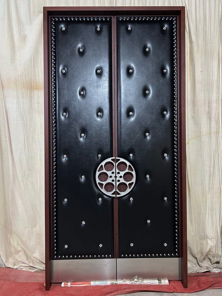 Luxurious Upholstered Panels: The doors feature plush, black upholstered panels, creating a sophisticated and inviting aesthetic. The deep, rich black evokes the ambiance of a classic movie theater, setting the perfect mood for your viewing experience.