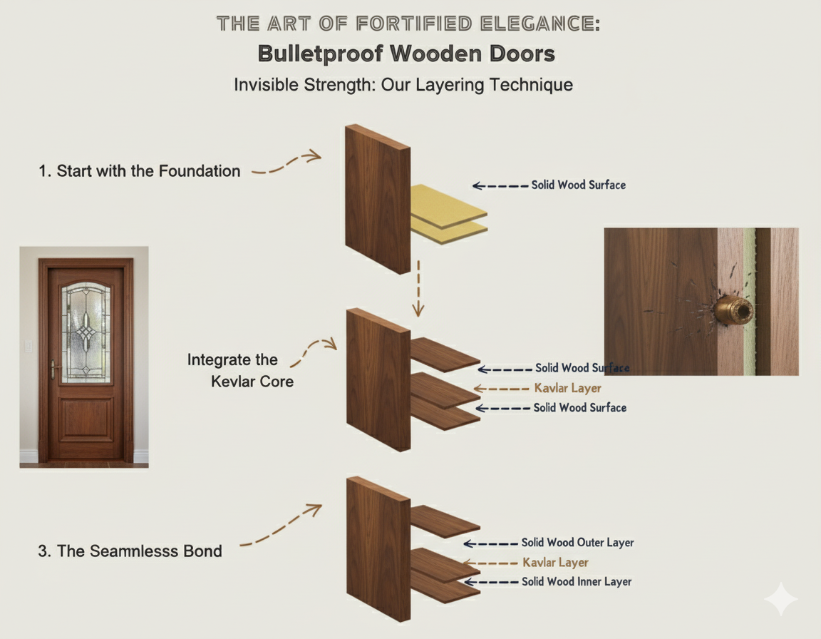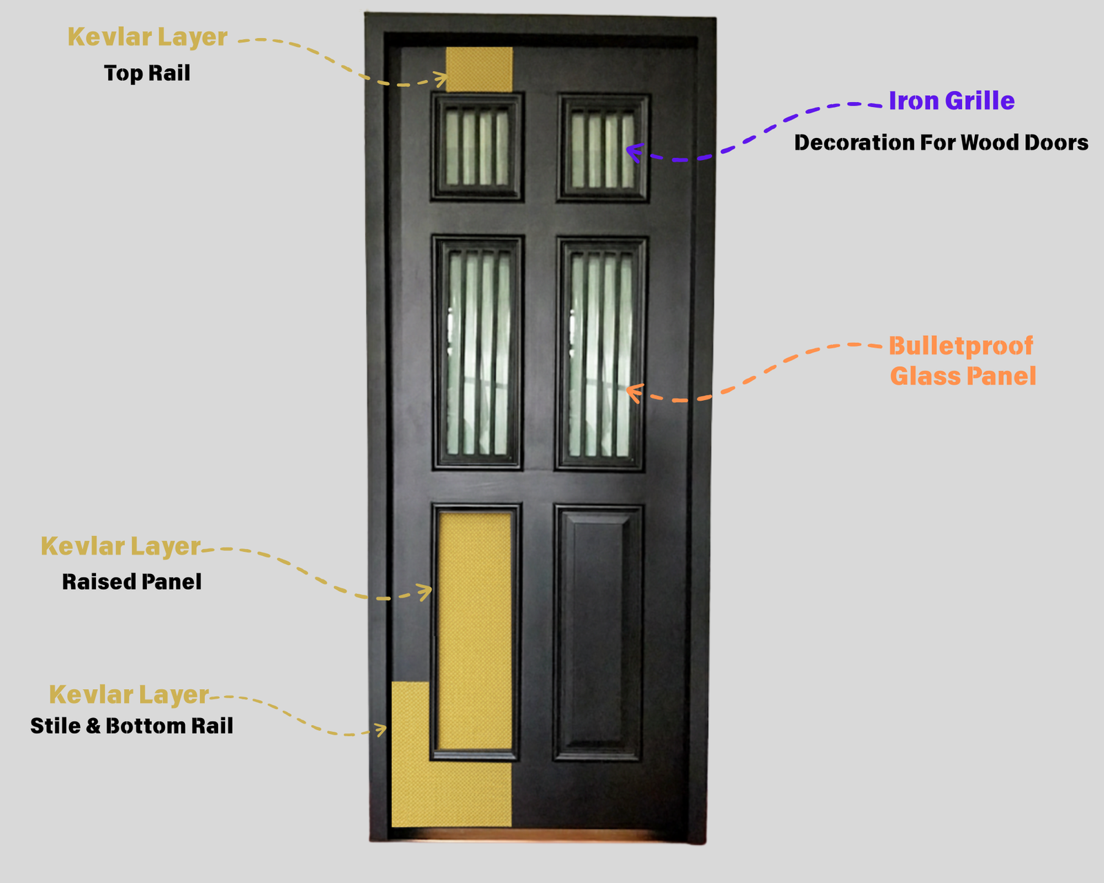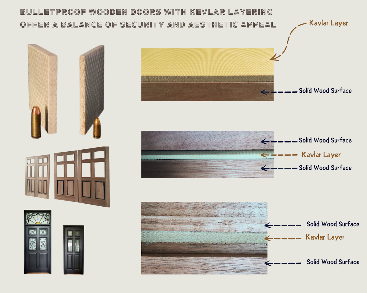Wood + Kevlar Core: The door looks like a normal luxury wood door but has a Kevlar shield inside.