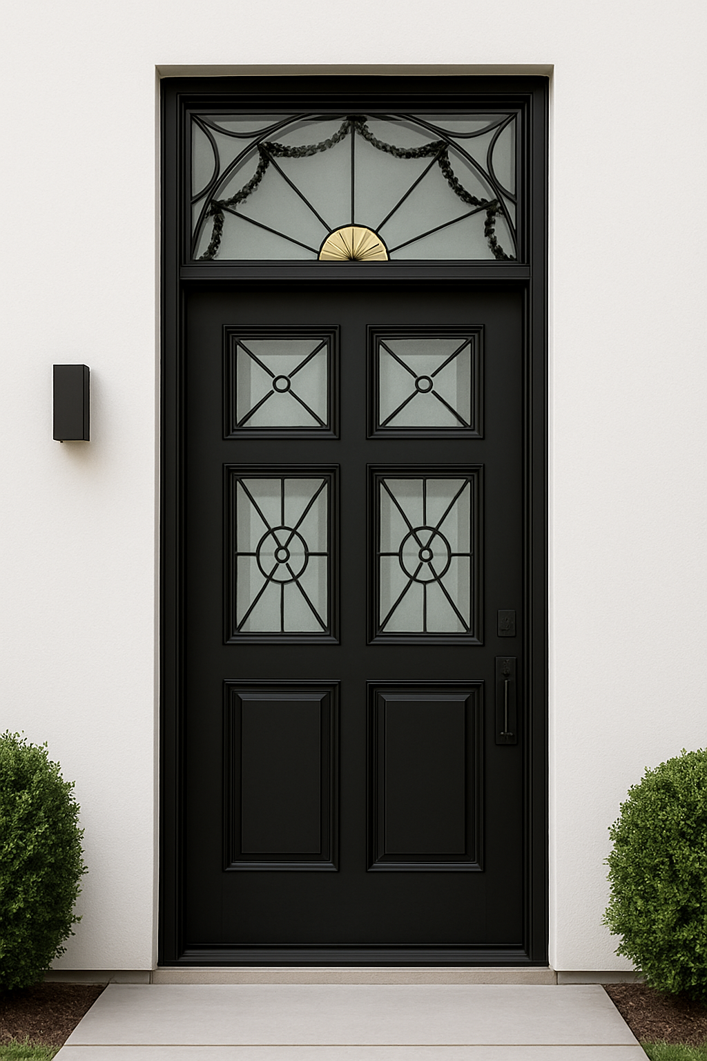 The Architectural Presence: Finished in a deep, commanding black, this entrance features classic applied moulding and a stunning transom with a decorative garland and sunburst detail. It elevates your home’s façade from a simple entrance to a grand, statement-making focal point.