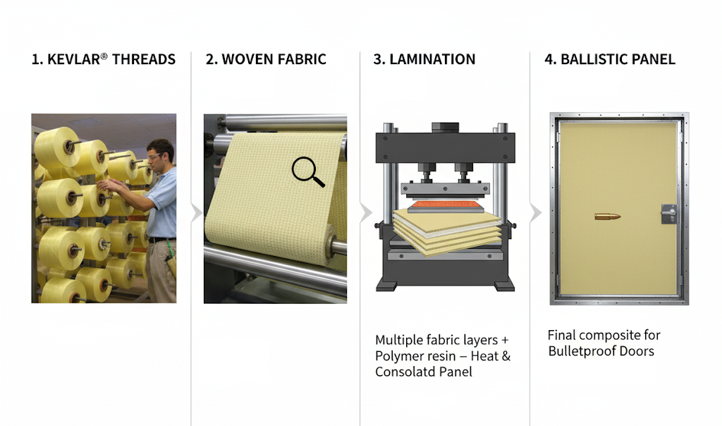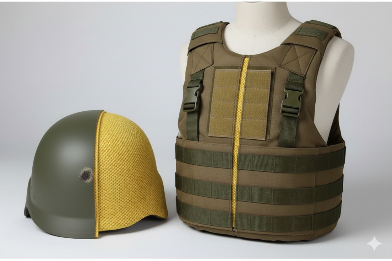The helmet and vest you see are the gold standard of personal protection, utilized by military and tactical forces worldwide. These life-saving products rely on multiple layers of high-tenacity Kevlar fiber—a material renowned for its incredible strength-to-weight ratio and ability to absorb and dissipate extreme impact energy. Just as these layers stop fragmentation and high-velocity rounds to protect a soldier, our multi-layered Kevlar panels are engineered to provide an impenetrable barrier within your door.