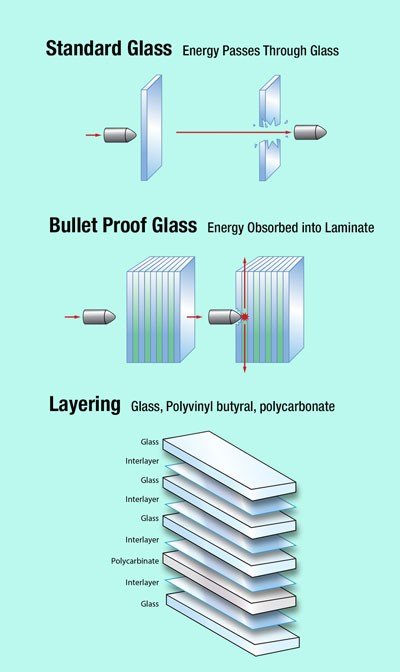 Bulletproof glass isn’t a single piece of hardened glass. It’s actually a laminated structure, typically made by layering: