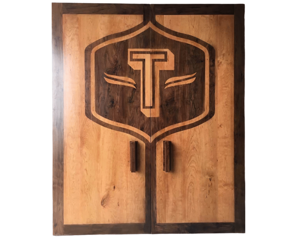 Introducing the ‘T’ Inlay Door, a striking example of fine woodworking and contemporary design. This door is a testament to the beauty of contrasting wood grains and the precision of expert craftsmanship.