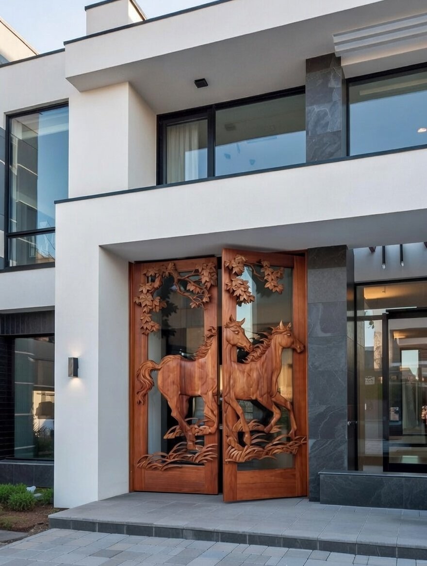 Elevate your home’s facade with a piece of functional art. This modern entry door utilizes oversized glass panels to showcase a meticulously detailed wood carving of a horse in motion. The assembly is perfectly balanced for modern luxury homes, providing a transparent, light-filled entryway that doesn’t sacrifice bold, individualistic style.