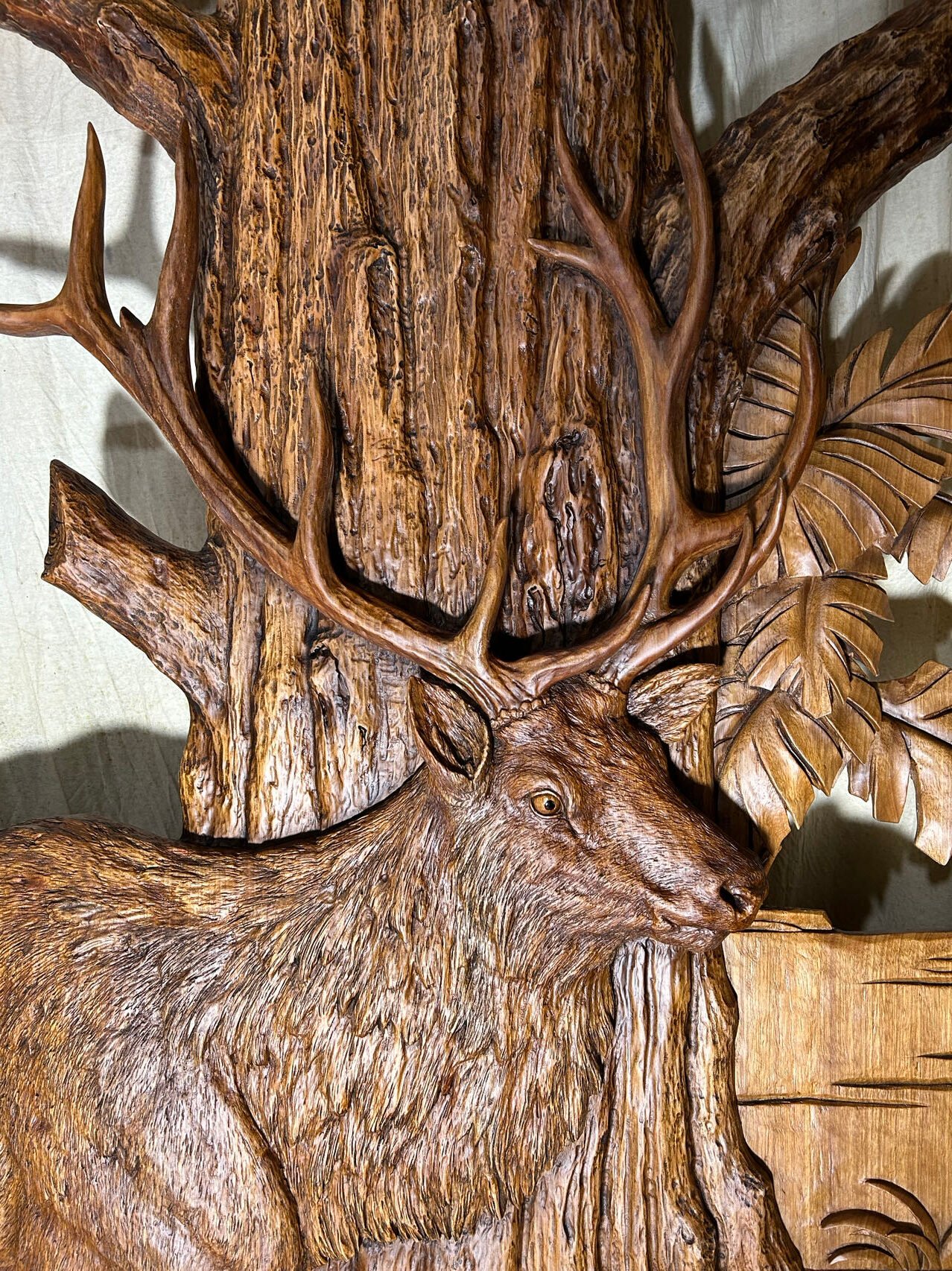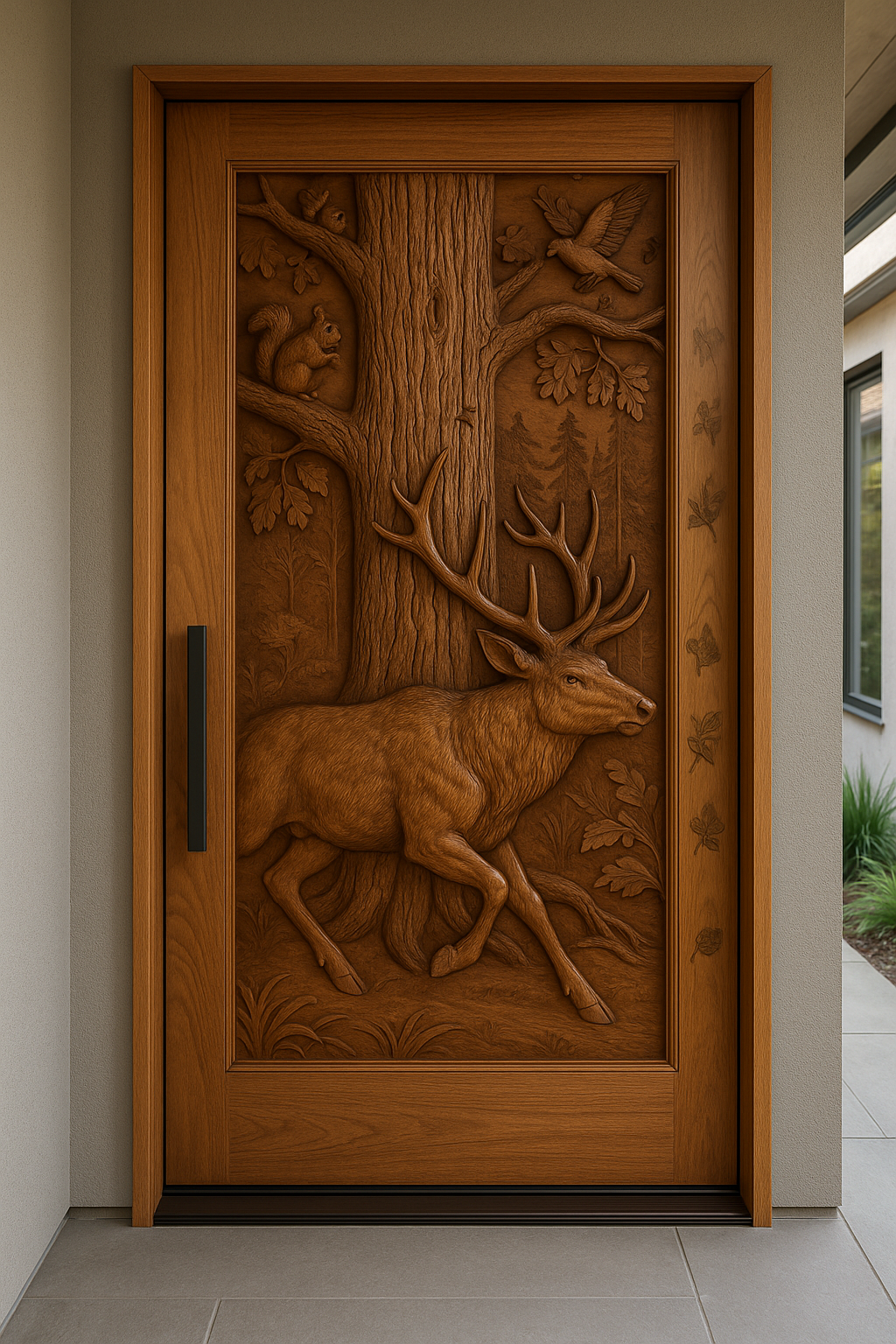 Customizable Designs: While this door is a stunning example, we specialize in creating custom wildlife doors tailored to your preferences. Imagine your favorite animals, trees, or landscapes brought to life in wood. (custom door, bespoke door, personalized door)