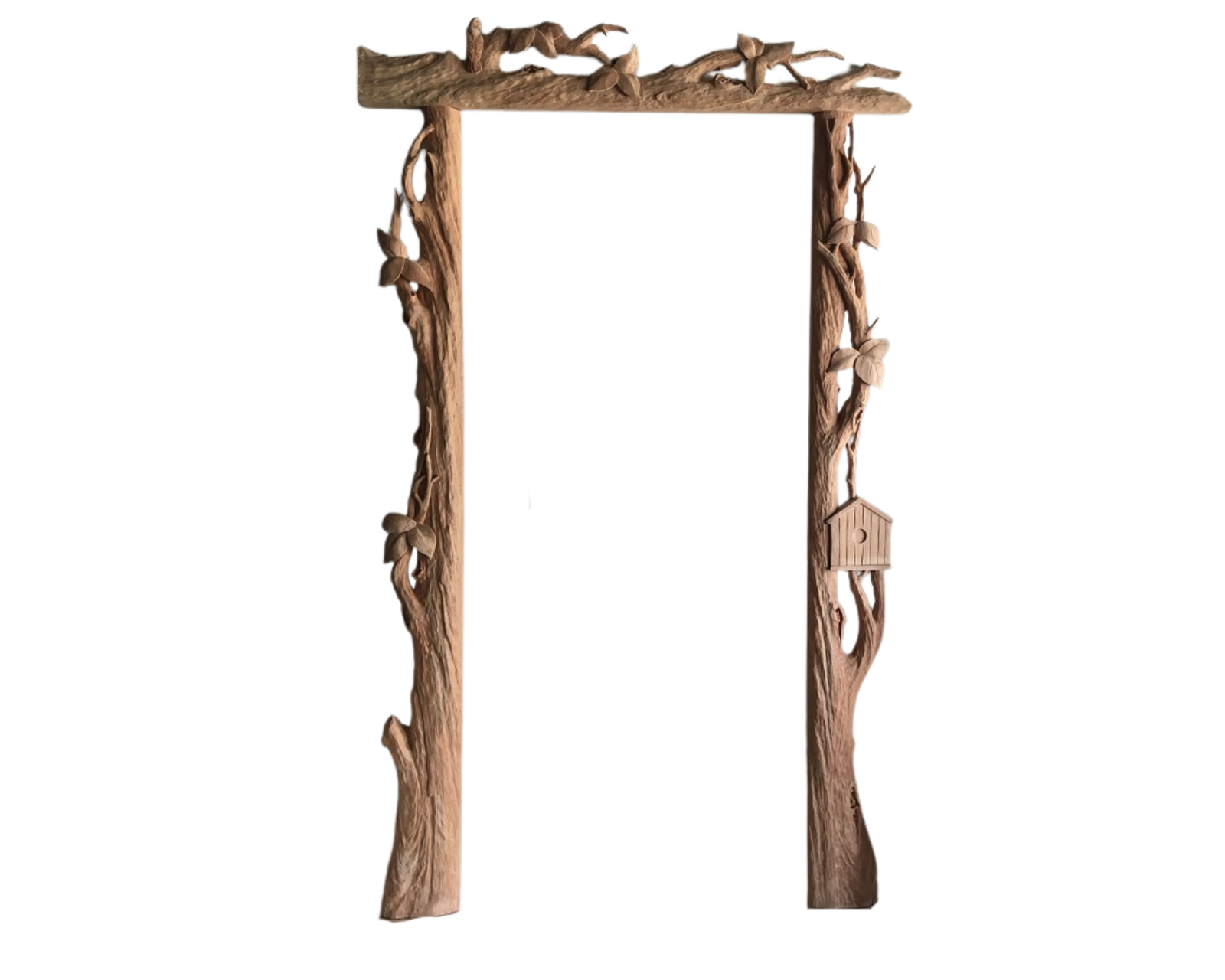 Left and Right Casings: These robust, yet elegantly sculpted, side casings evoke the feeling of weathered tree trunks, complete with intricately carved branches that reach upwards and outwards. Note the charming, miniature hand-carved birdhouse nestled quaintly into the branches on the right-hand casing – a delightful touch that speaks to the artisan’s attention to detail and love for nature.