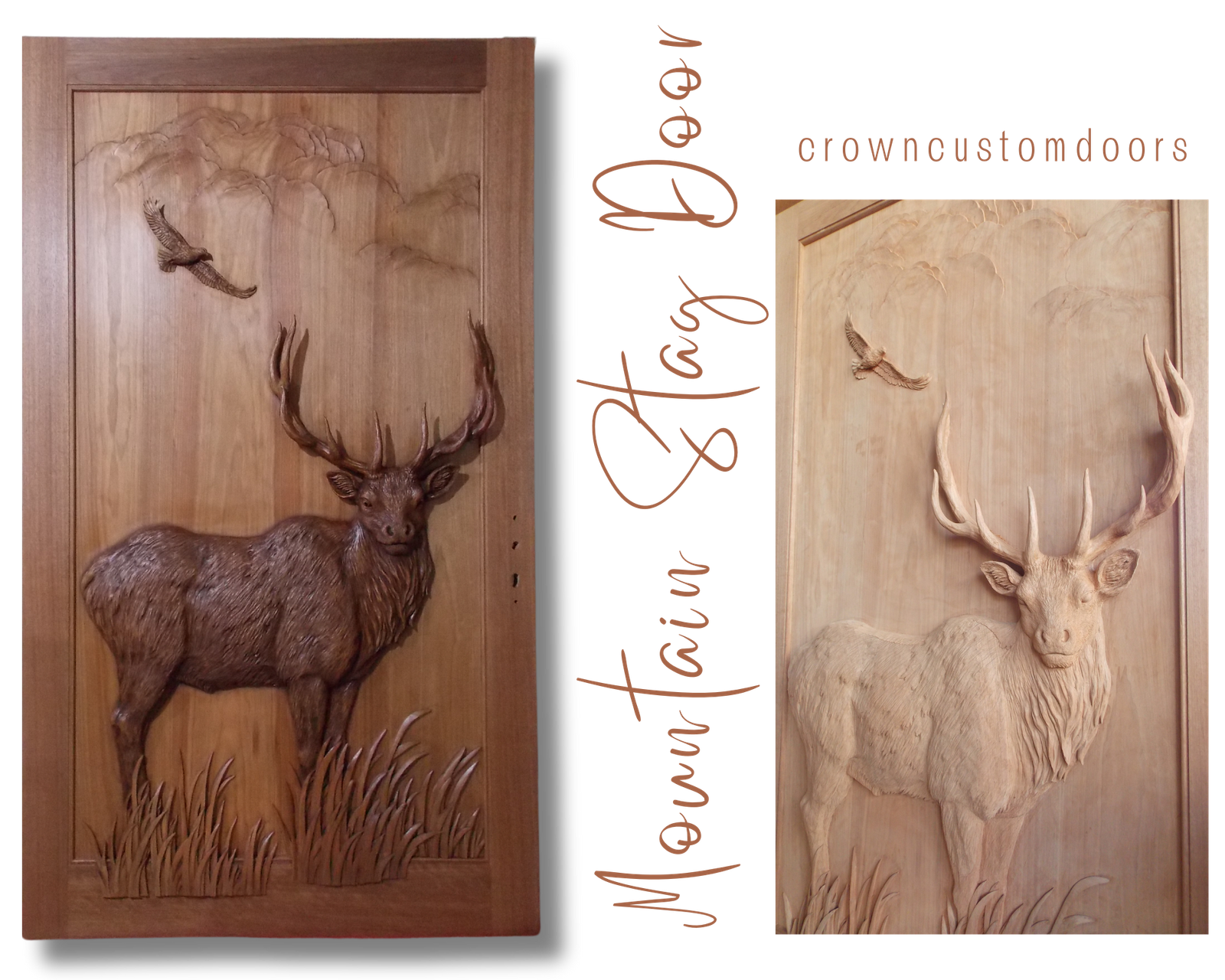 The timeless design of the “Mountain Stag Door” seamlessly blends with a variety of interior styles, from rustic and traditional to contemporary and nature-inspired. It serves as a stunning focal point for front entrances, cabins, lodges, or any space seeking a touch of natural elegance.