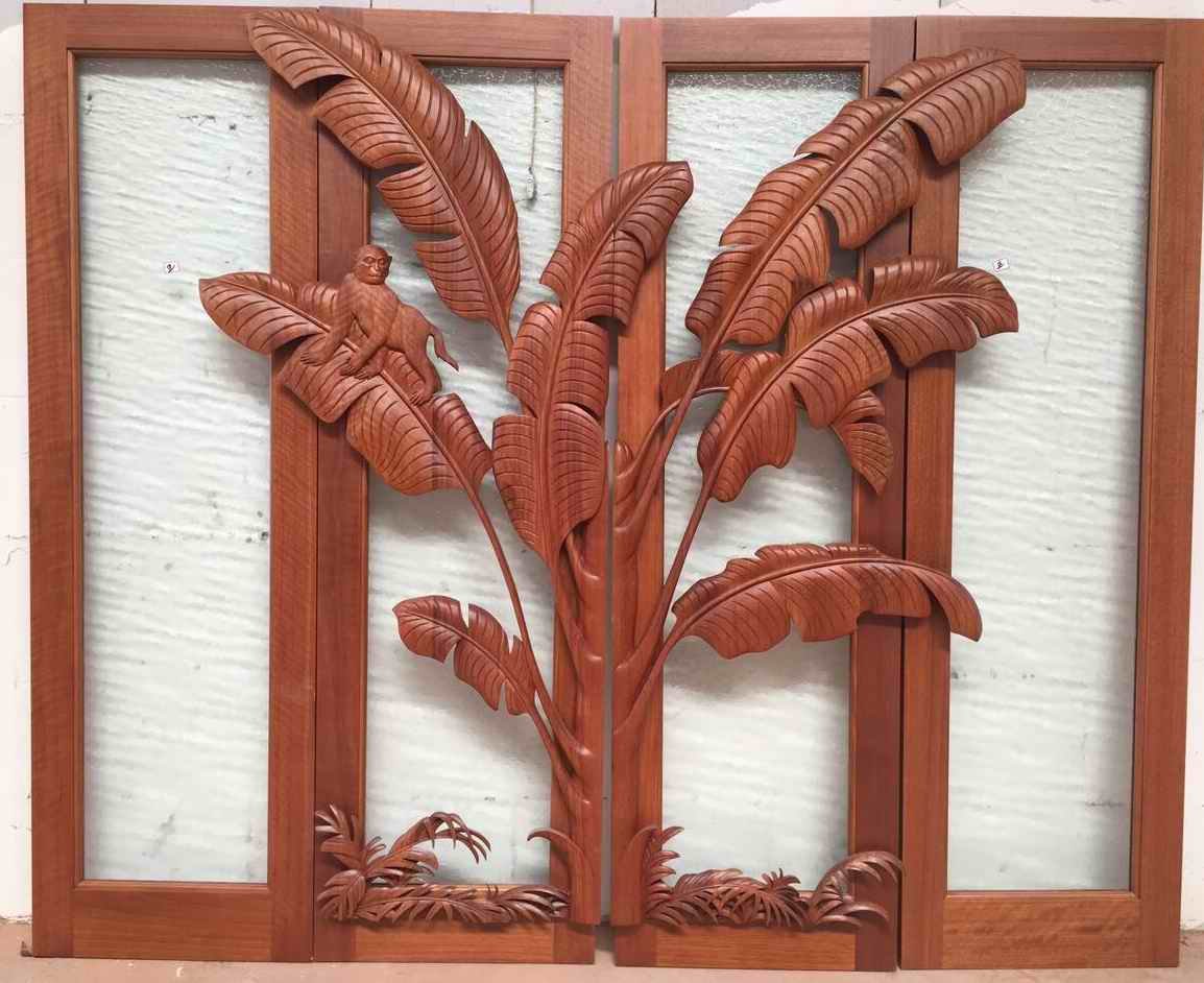 Hand-carved tropical leaf and monkey design, showcasing intricate detailing and natural beauty.