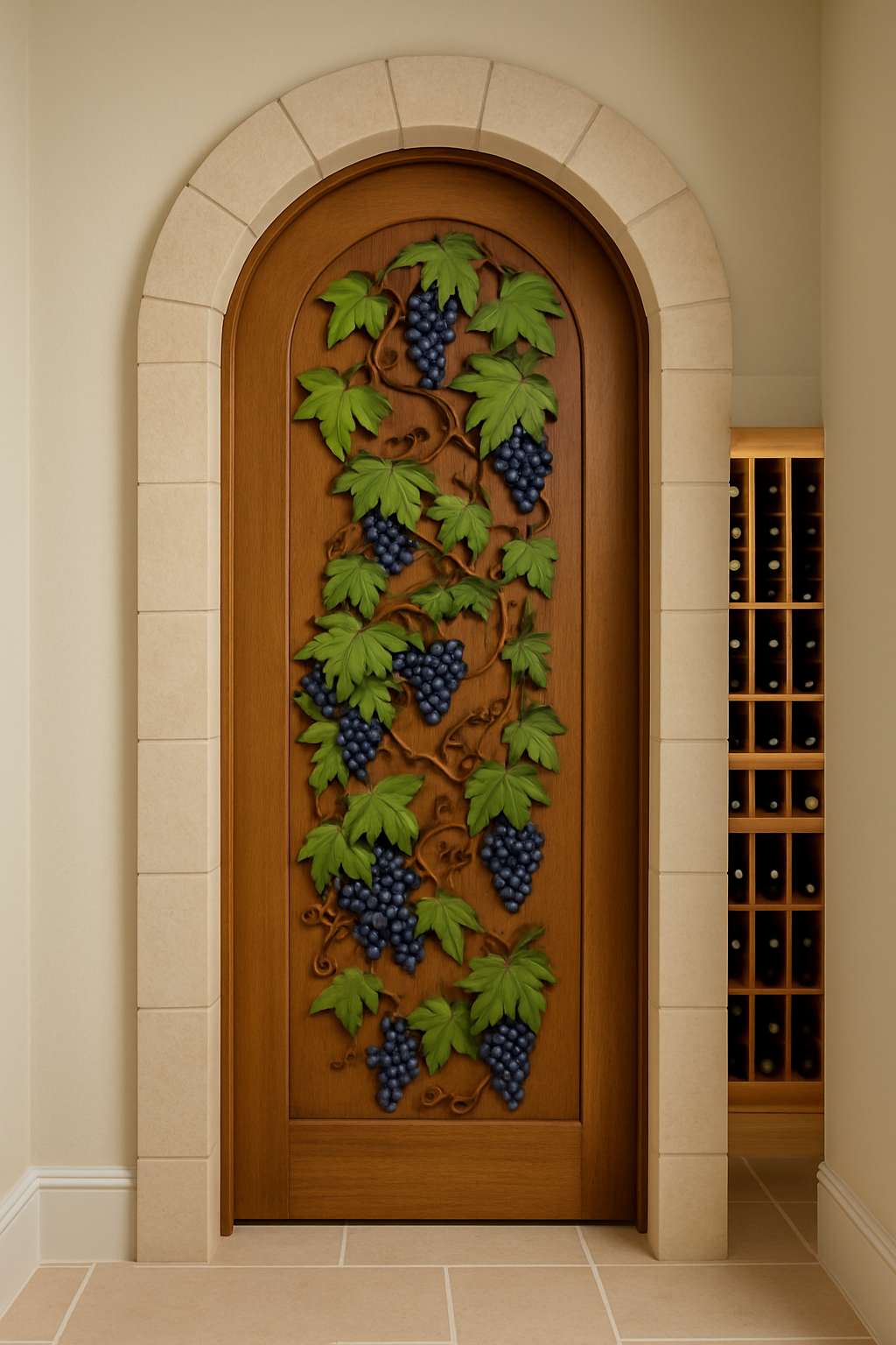 Elevate your wine cellar from a storage space to a statement of refined taste with our exquisite handcrafted wine cellar doors. Designed for the discerning collector, these doors are more than just an entry point – they are a beautifully crafted threshold into your personal sanctuary of vintages. Featuring elegant wrought iron details with a charming grape motif, and rich, solid wood construction, this arched door perfectly frames the treasures within, promising both aesthetic grandeur and optimal climate control for your prized collection.