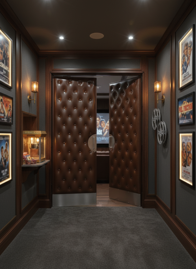 Before the movie even begins, the entrance should create anticipation. These double doors are wrapped in rich, tufted upholstery, giving them a bold, cinematic presence. The deep button-tufted pattern adds: